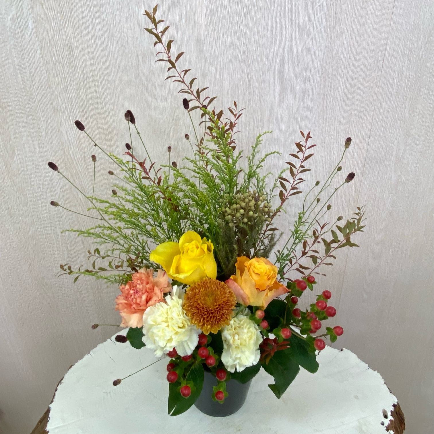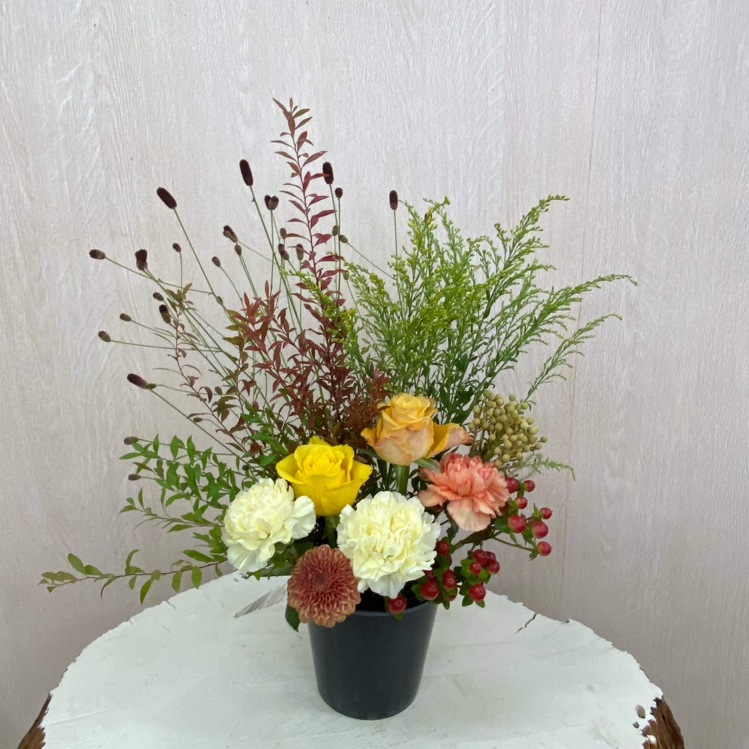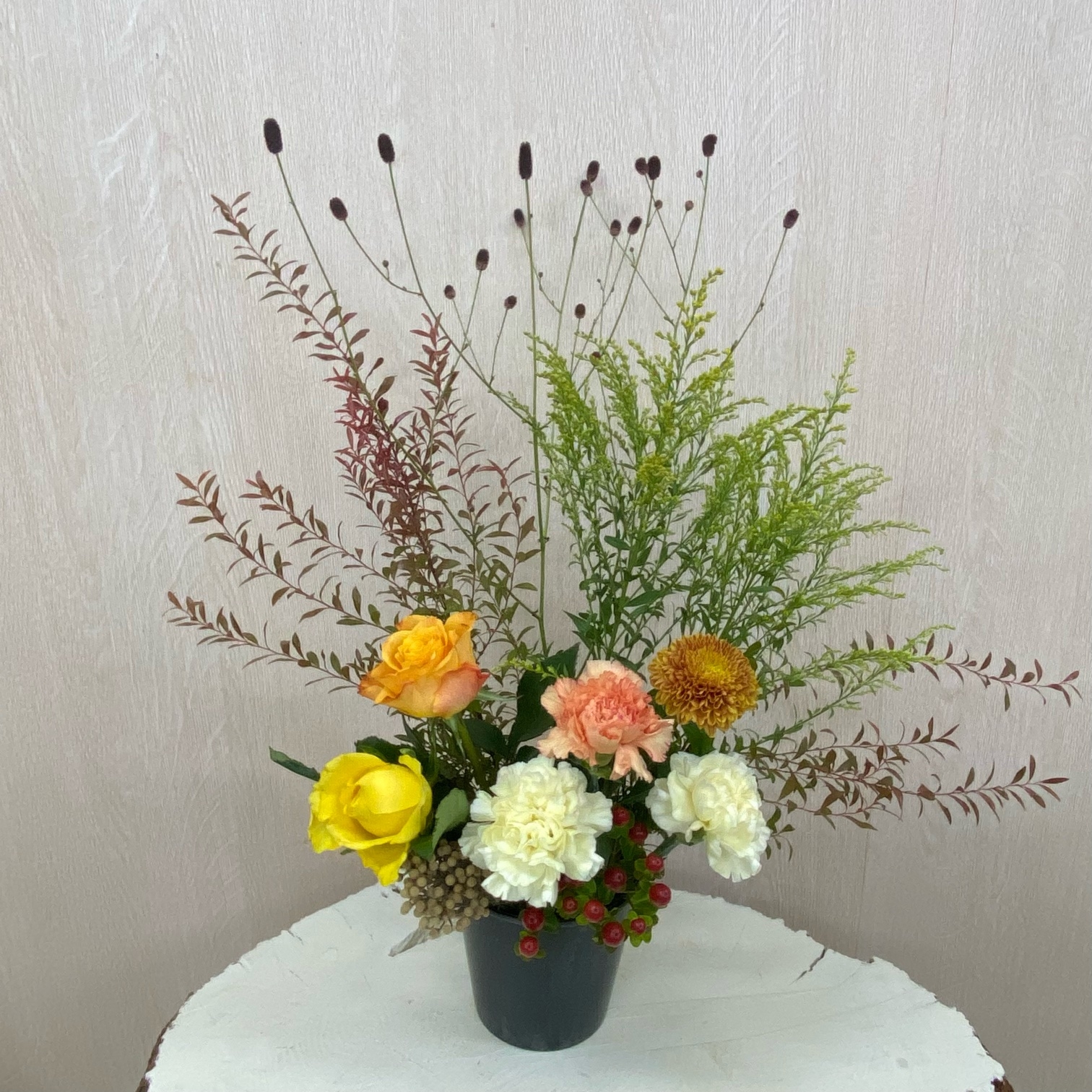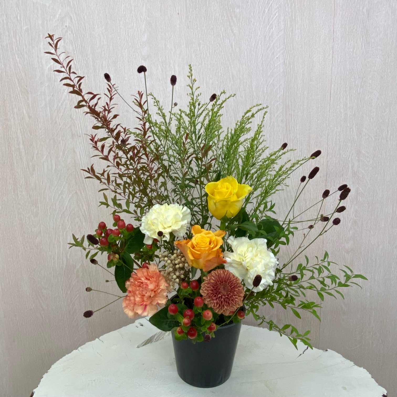 花材◇ヌリ雪柳/吾亦紅/ソリダコ/バラ(オレンジ・イエロー)/カーネーション(クリーム・オレンジ)/マム(茶色)/ヒペリカム/バーゼリア ラヌギノーサ