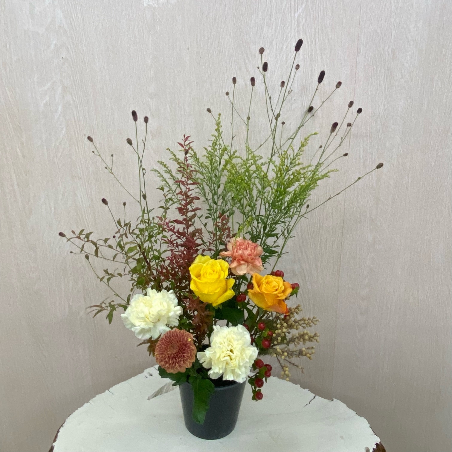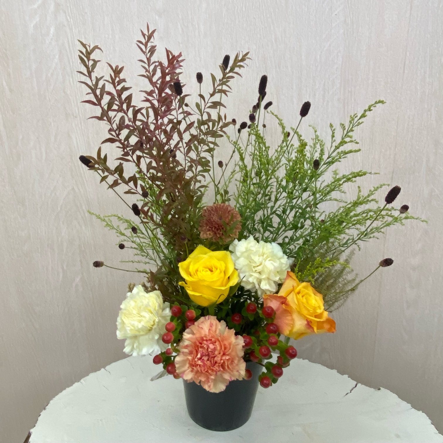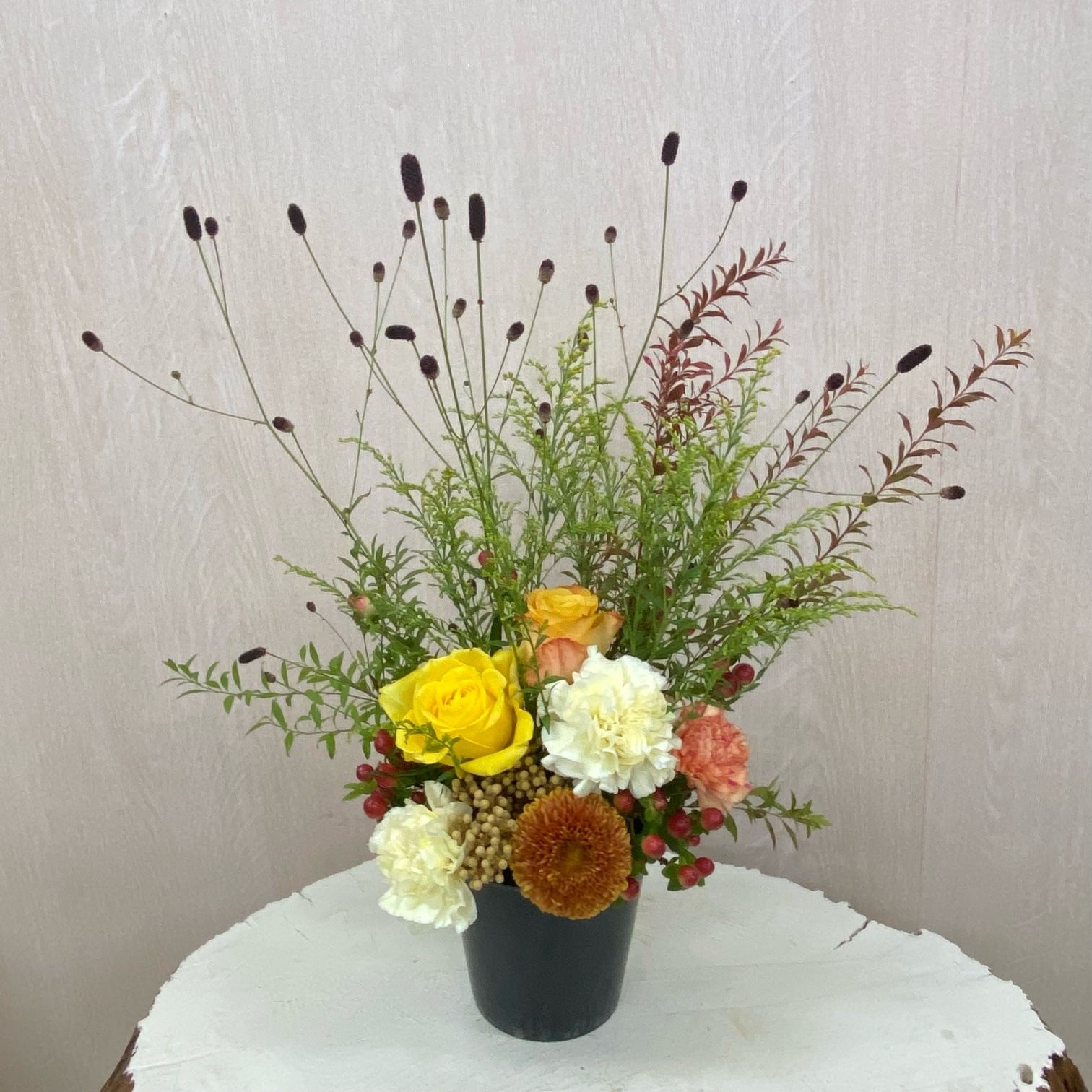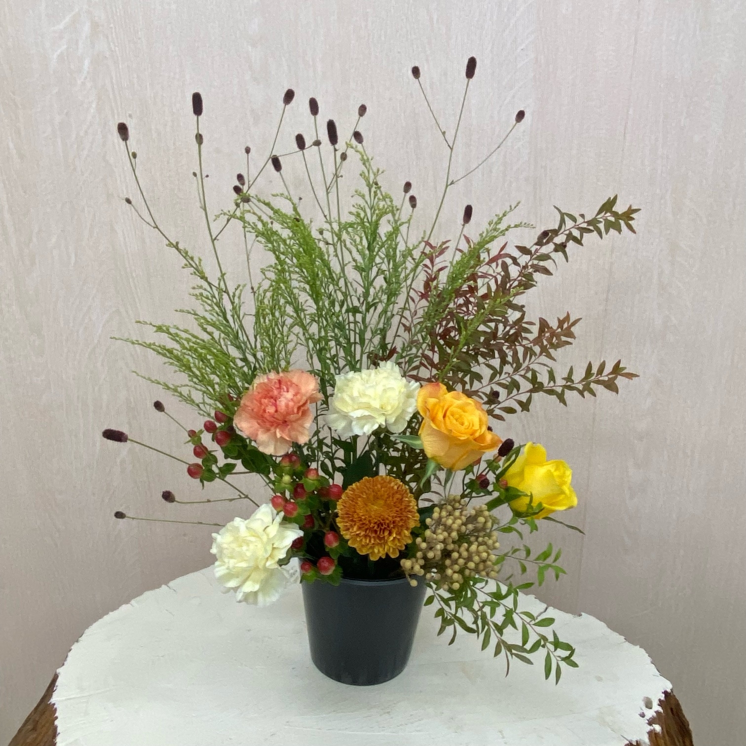 花材◇ヌリ雪柳/吾亦紅/ソリダコ/バラ(オレンジ・イエロー)/カーネーション(クリーム・オレンジ)/マム(茶色)/ヒペリカム/バーゼリア ラヌギノーサ