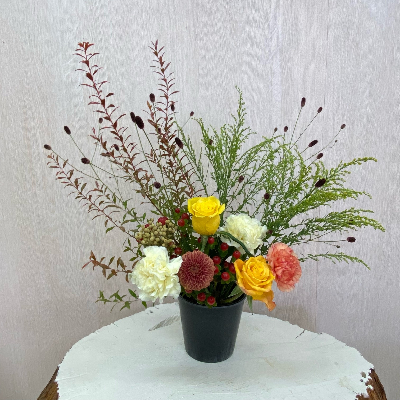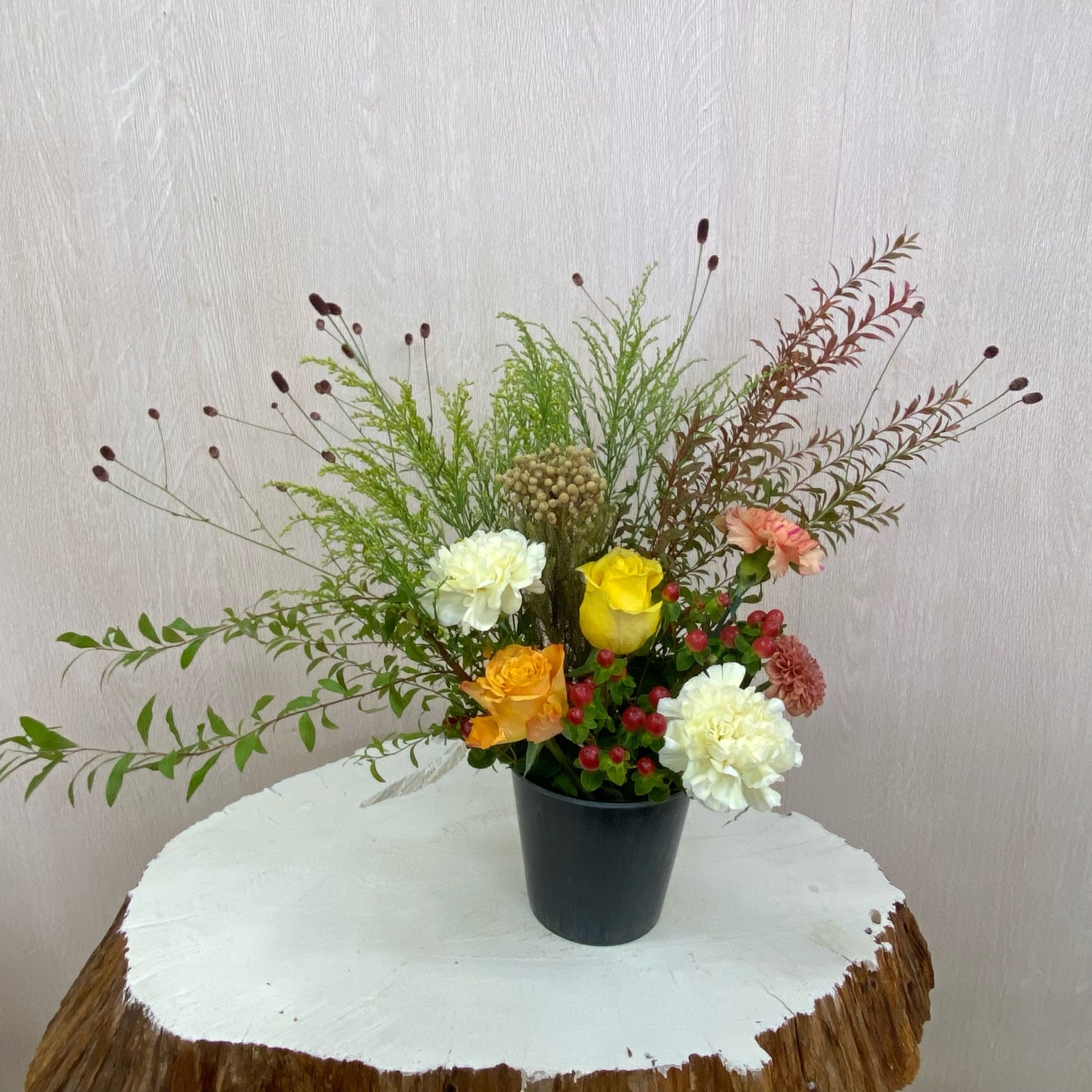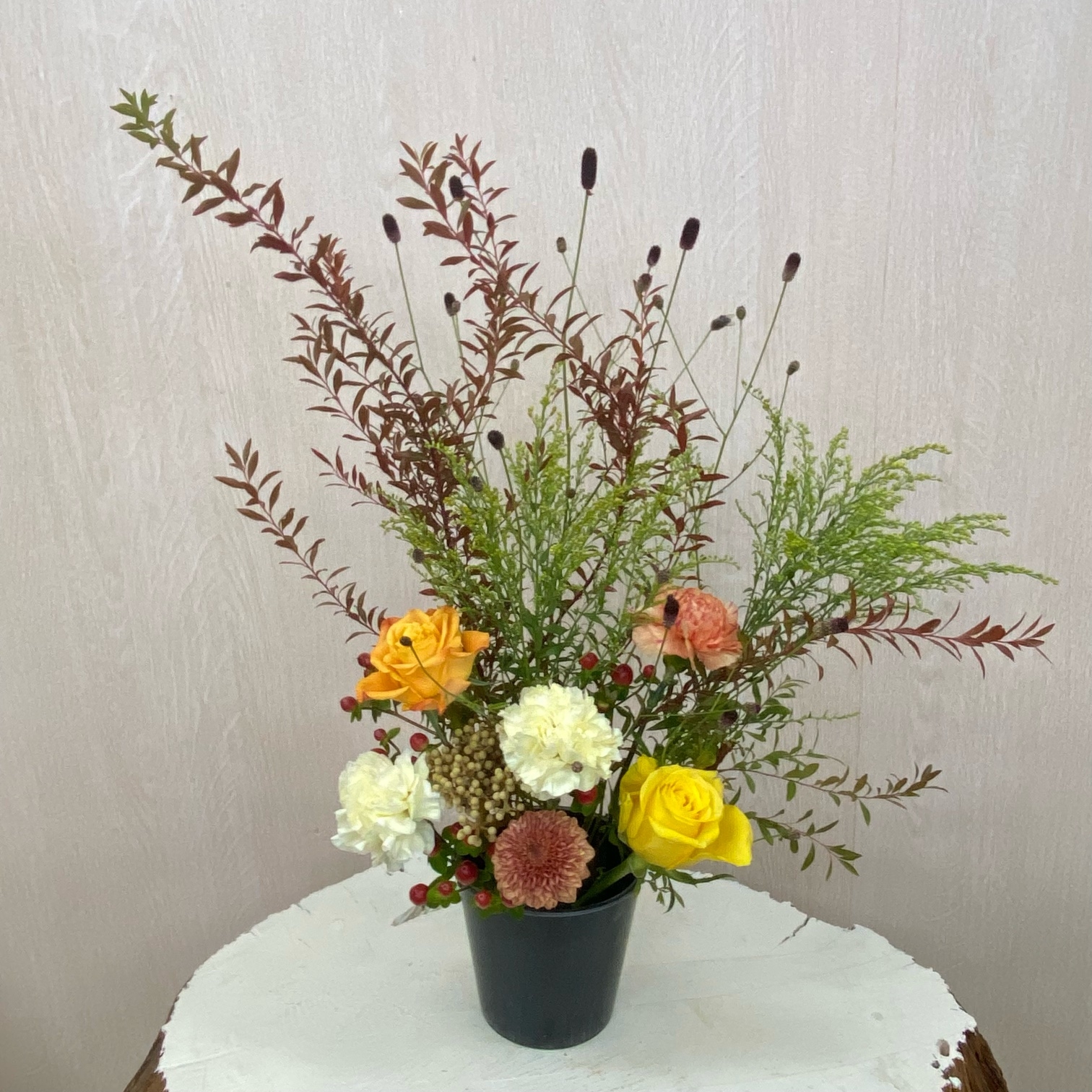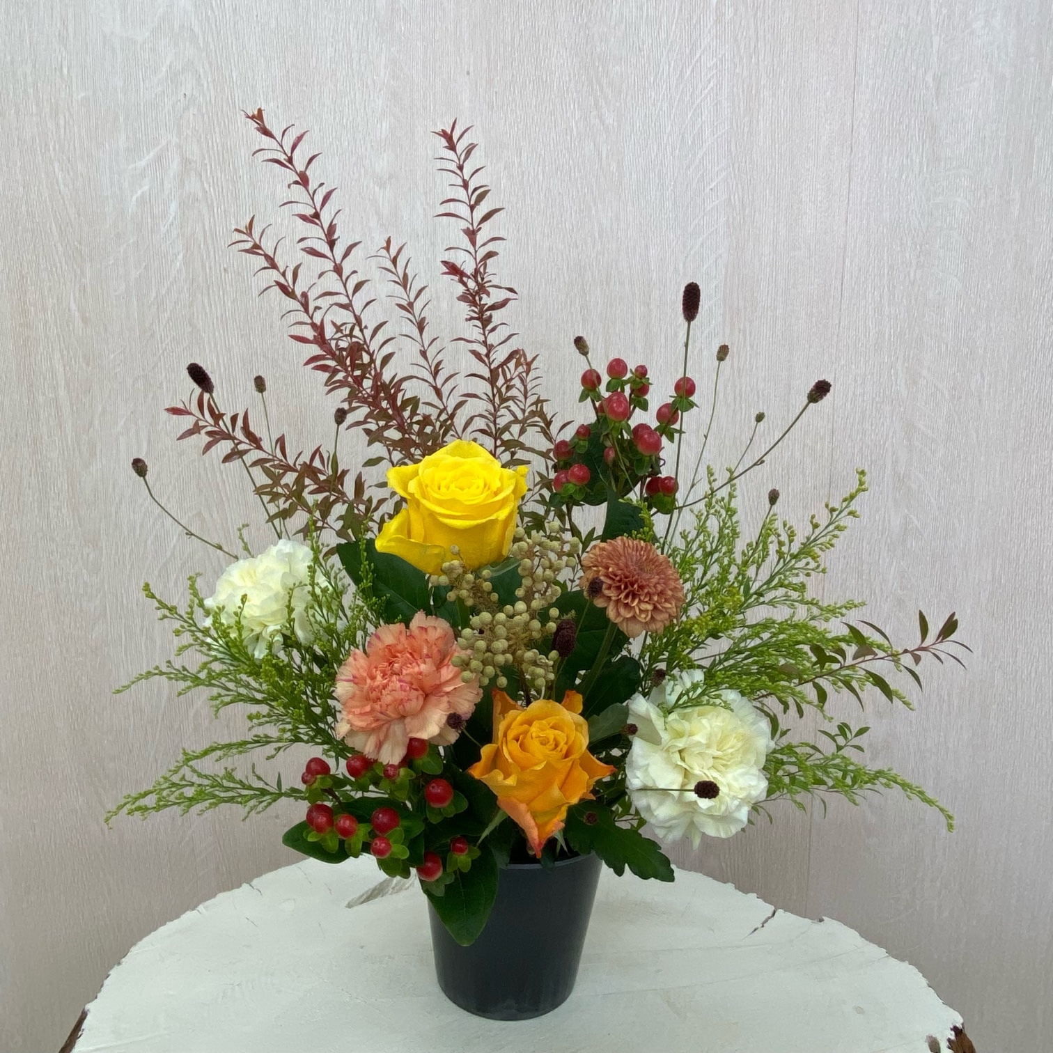 花材◇ヌリ雪柳/吾亦紅/ソリダコ/バラ(オレンジ・イエロー)/カーネーション(クリーム・オレンジ)/マム(茶色)/ヒペリカム/バーゼリア ラヌギノーサ