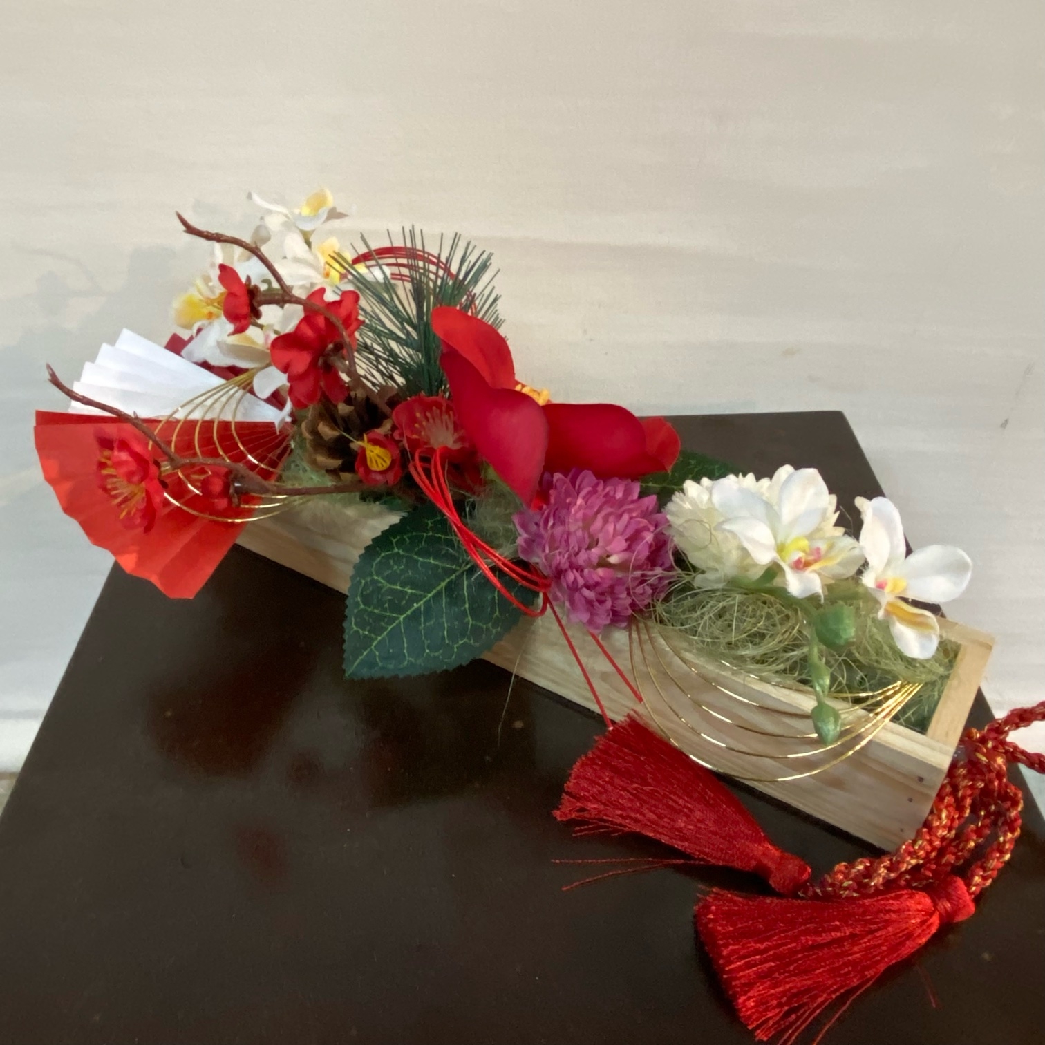 木製の箱にアレンジしていく構造です。扇子や水引で和風の雰囲気が出てきます。
