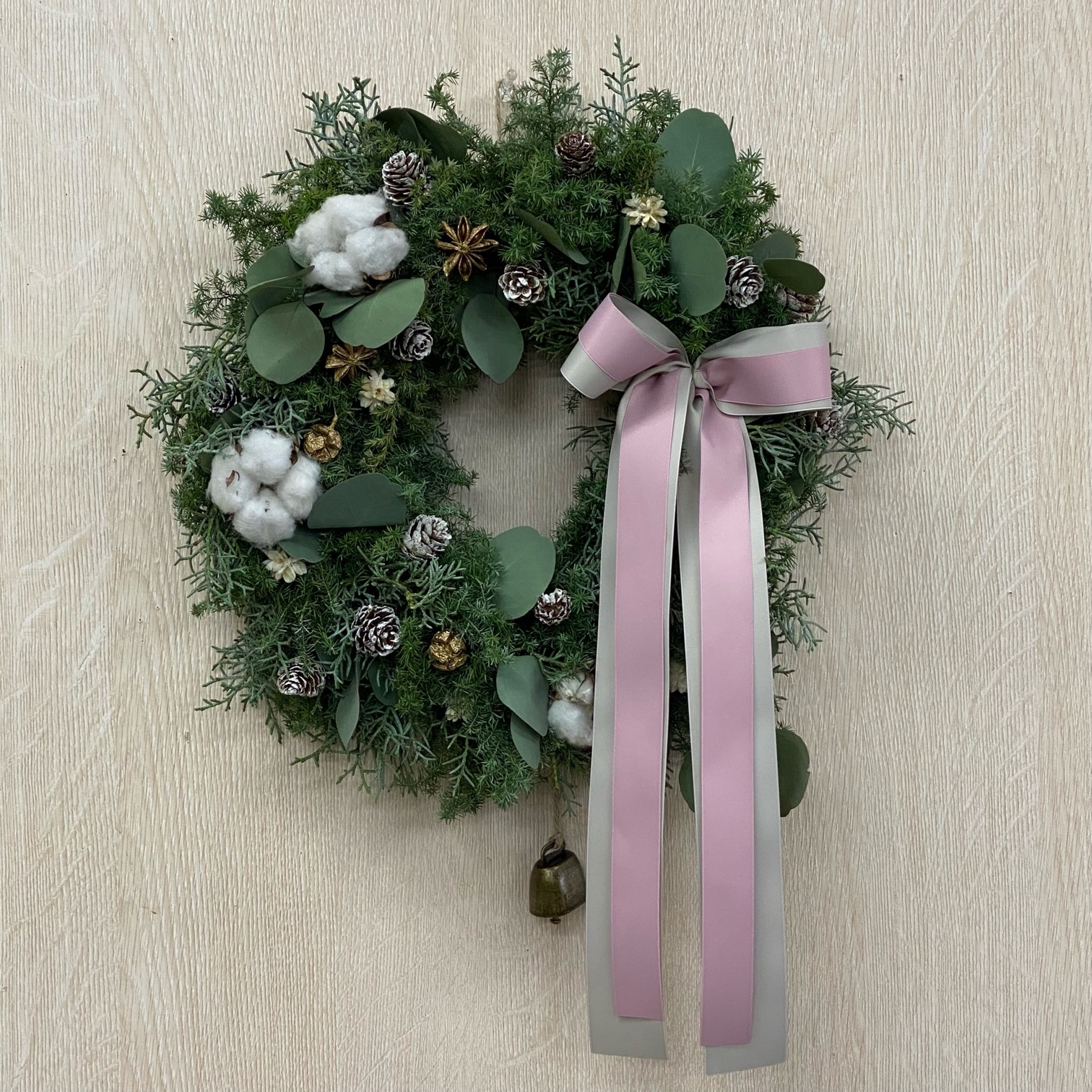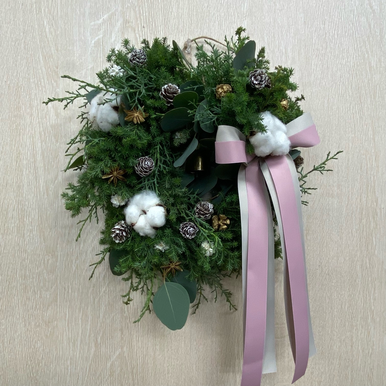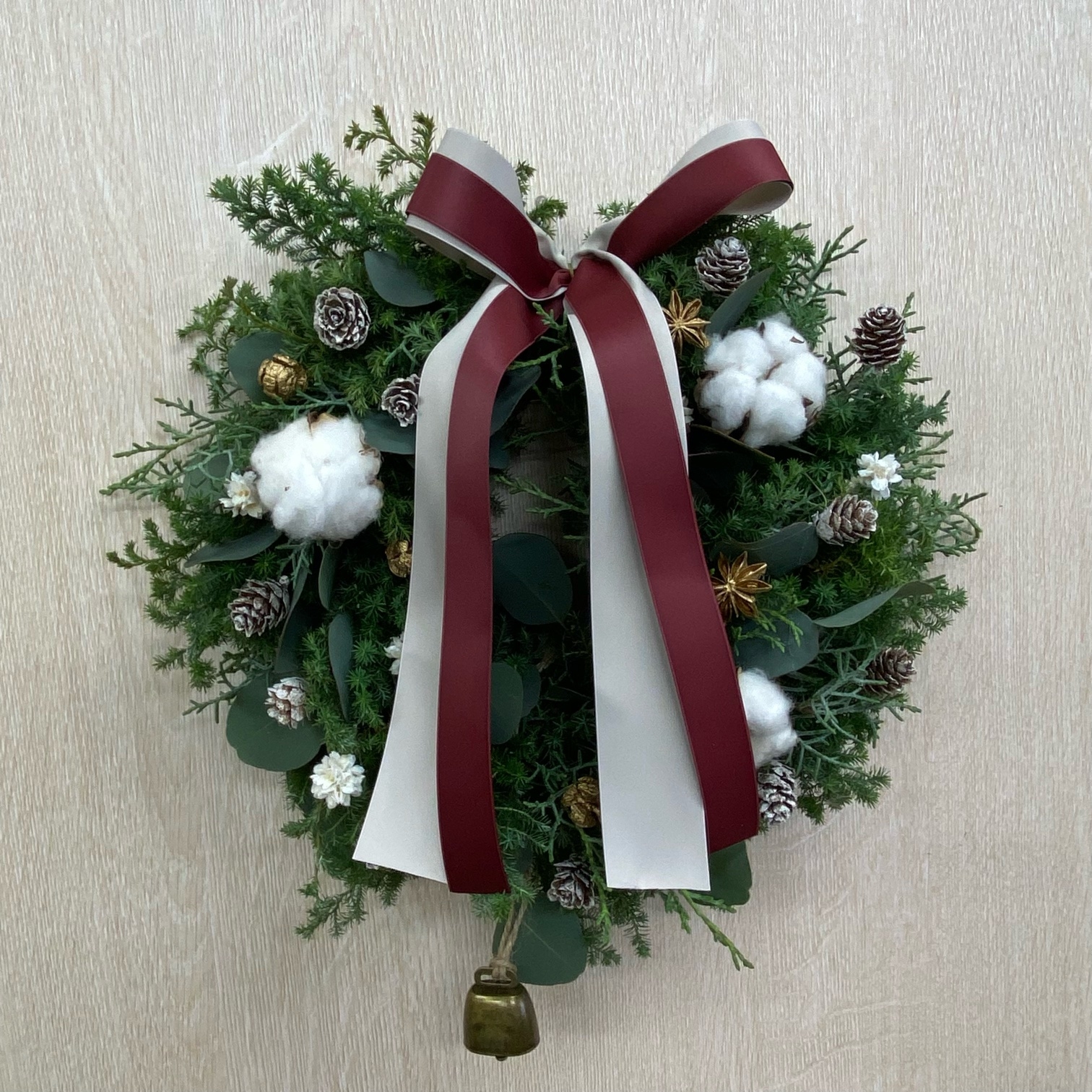 花材◇ヒムロスギ30/ブルーアイス23/ユーカリ・ポポラス15/コットン/カウベル/カラマツ/スターアニス/ヒノキ/フラワーコーン