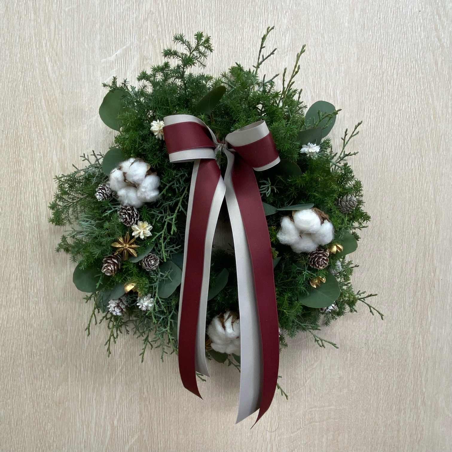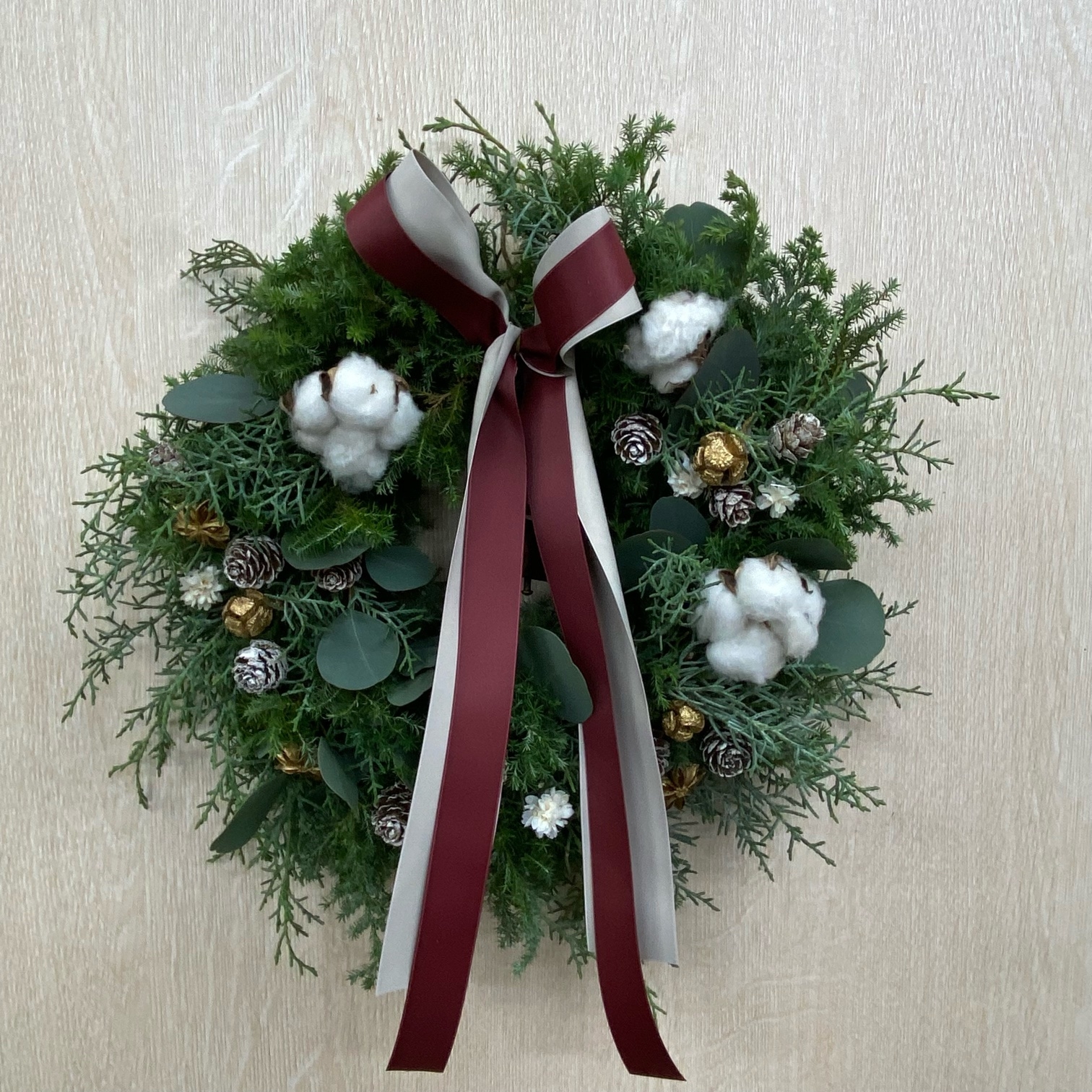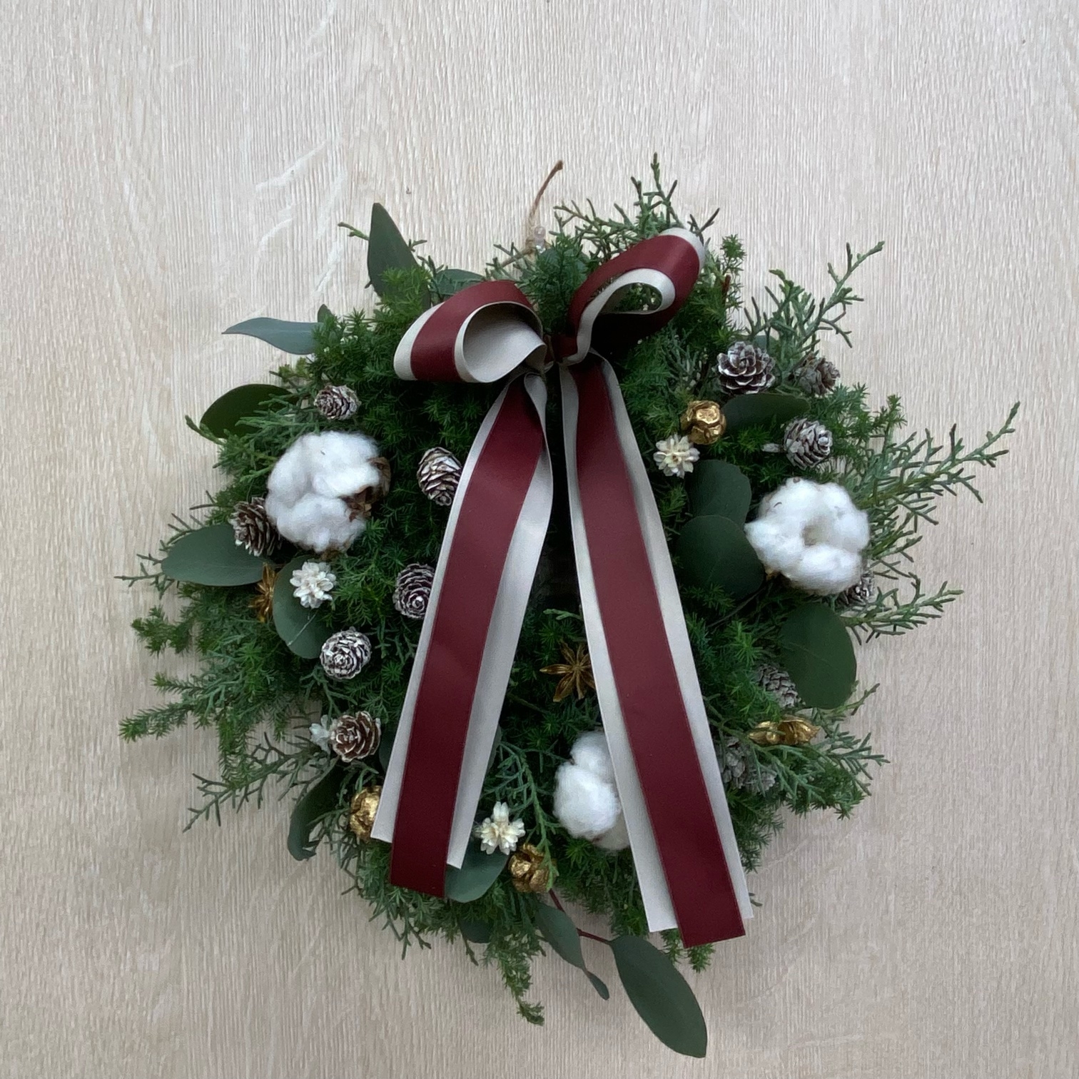 花材◇ブルーアイス/ヒムロ杉/モミ/リューカデンドロン2種/コットン/ゴールドサンキライ/スパイダーガム・クロウ/シナモン/リボン2種