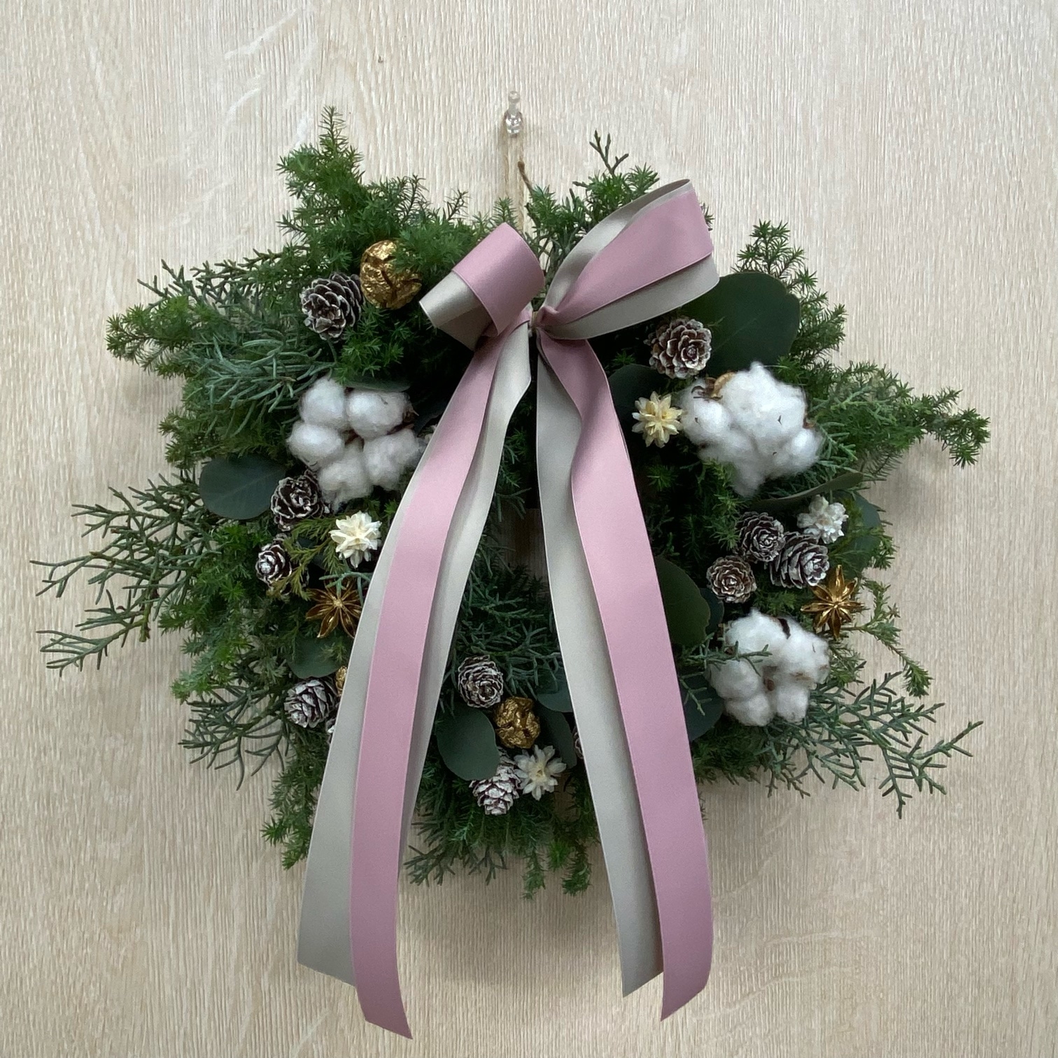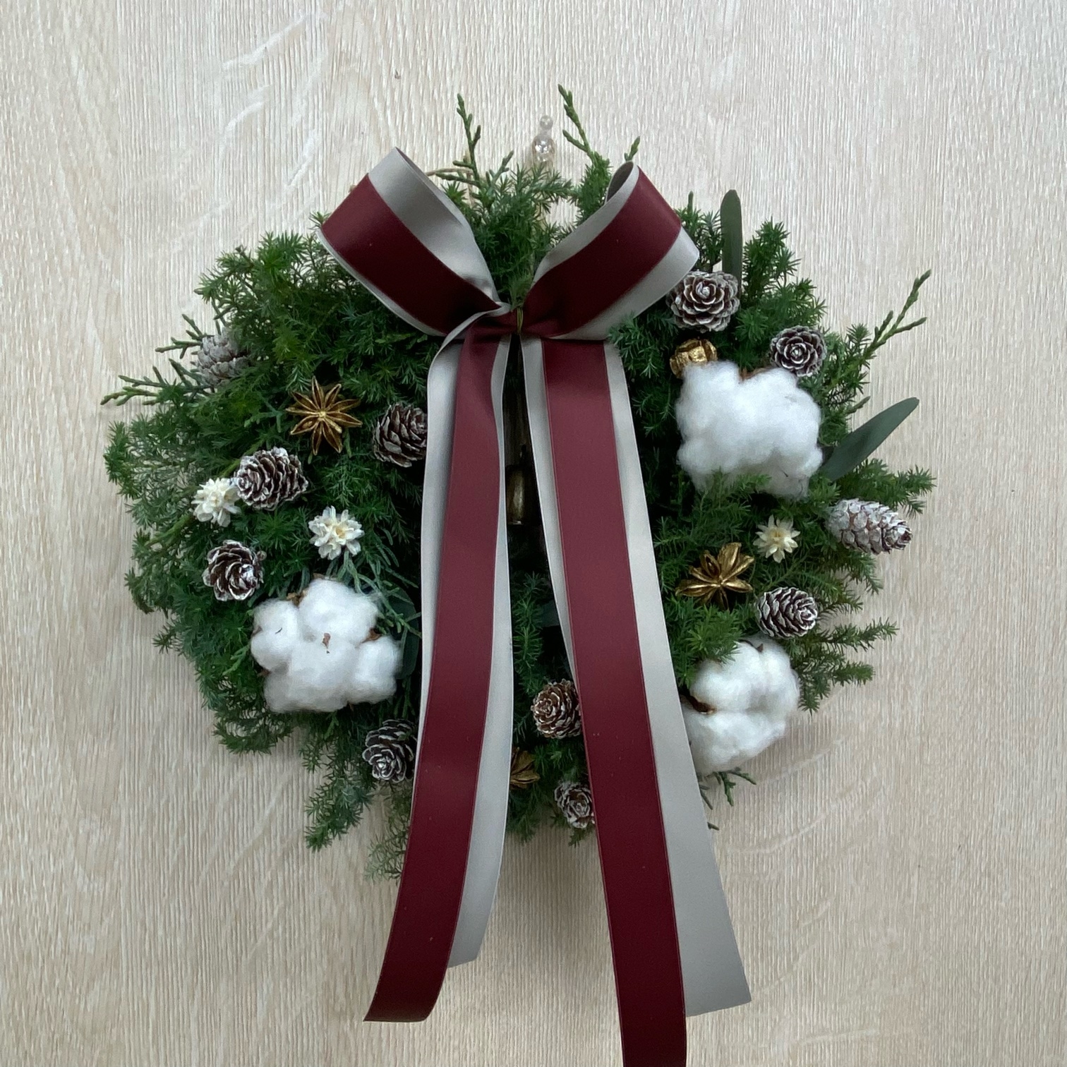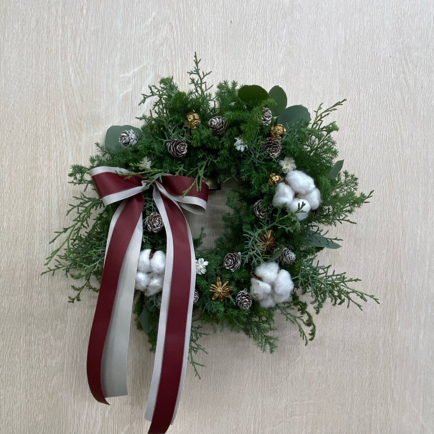 花材◇ブルーアイス/ヒムロ杉/モミ/リューカデンドロン2種/コットン/ゴールドサンキライ/スパイダーガム・クロウ/シナモン/リボン2種