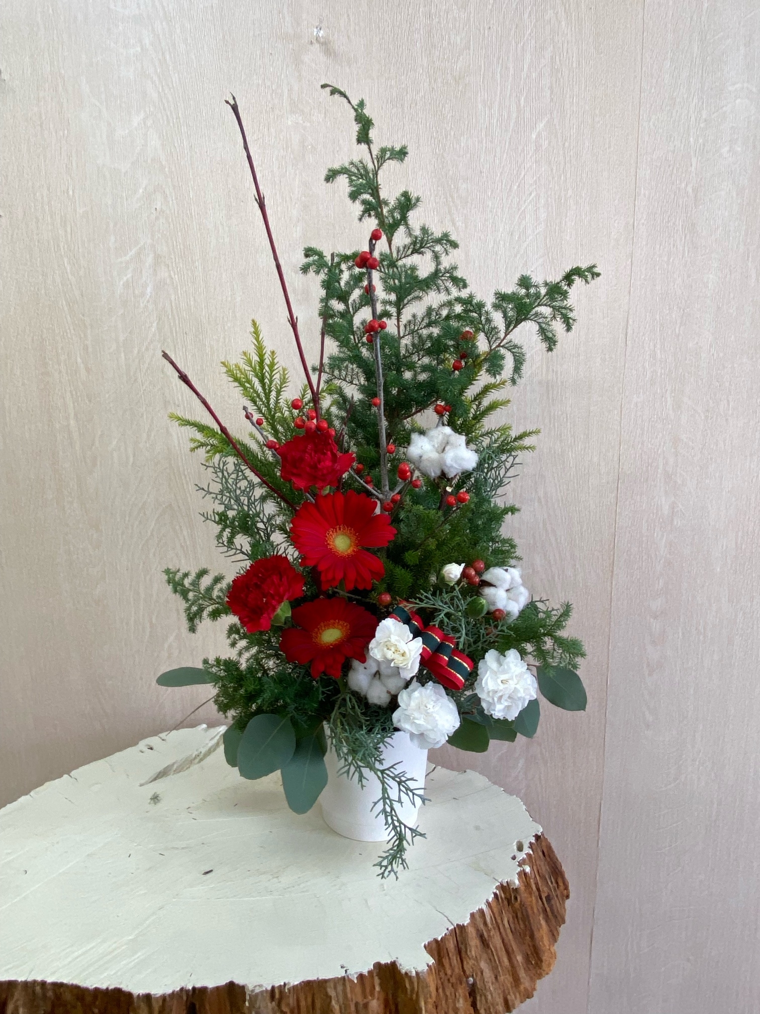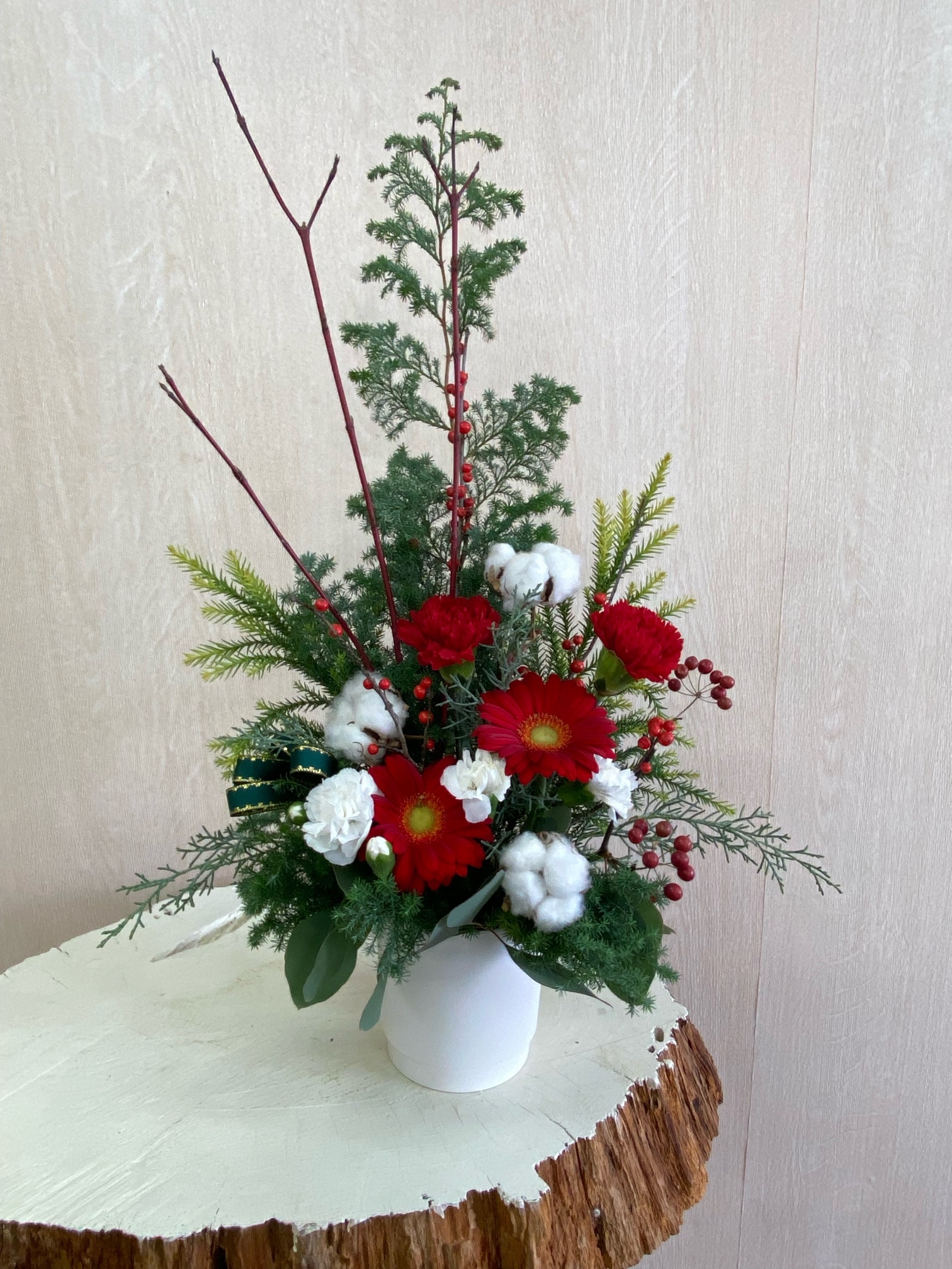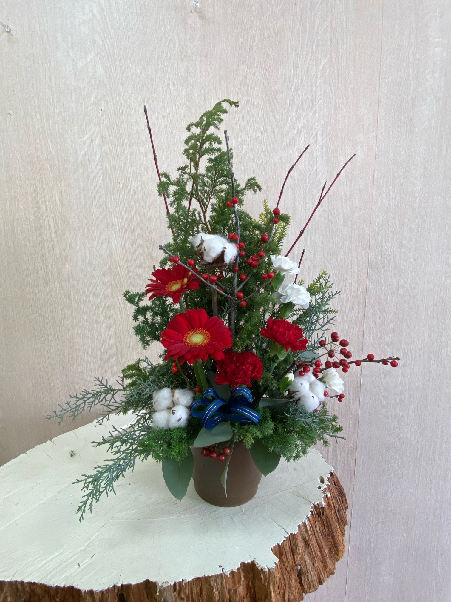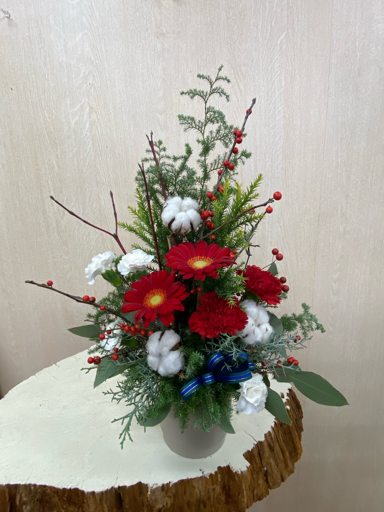花材◇ヒムロ杉/雪冠杉/ブルーアイス/カーネーション/ガーベラ/コットンフラワー/ウィンターベリー・クリスマスチェアー(西洋ウメモドキ)/サンキライ/ユーカリ・ポポラス
