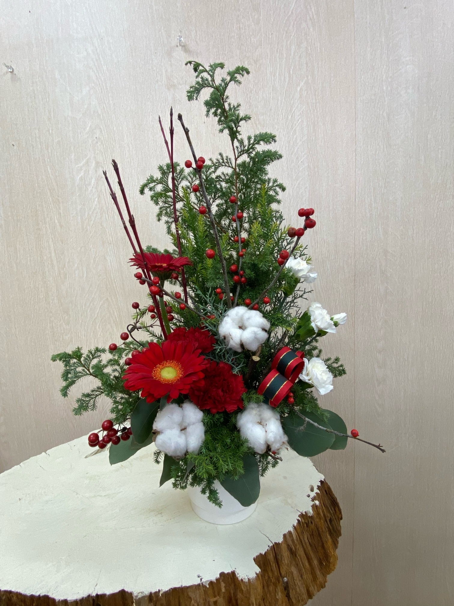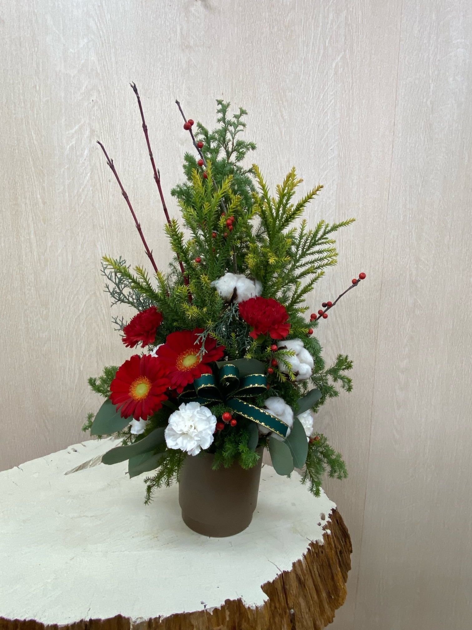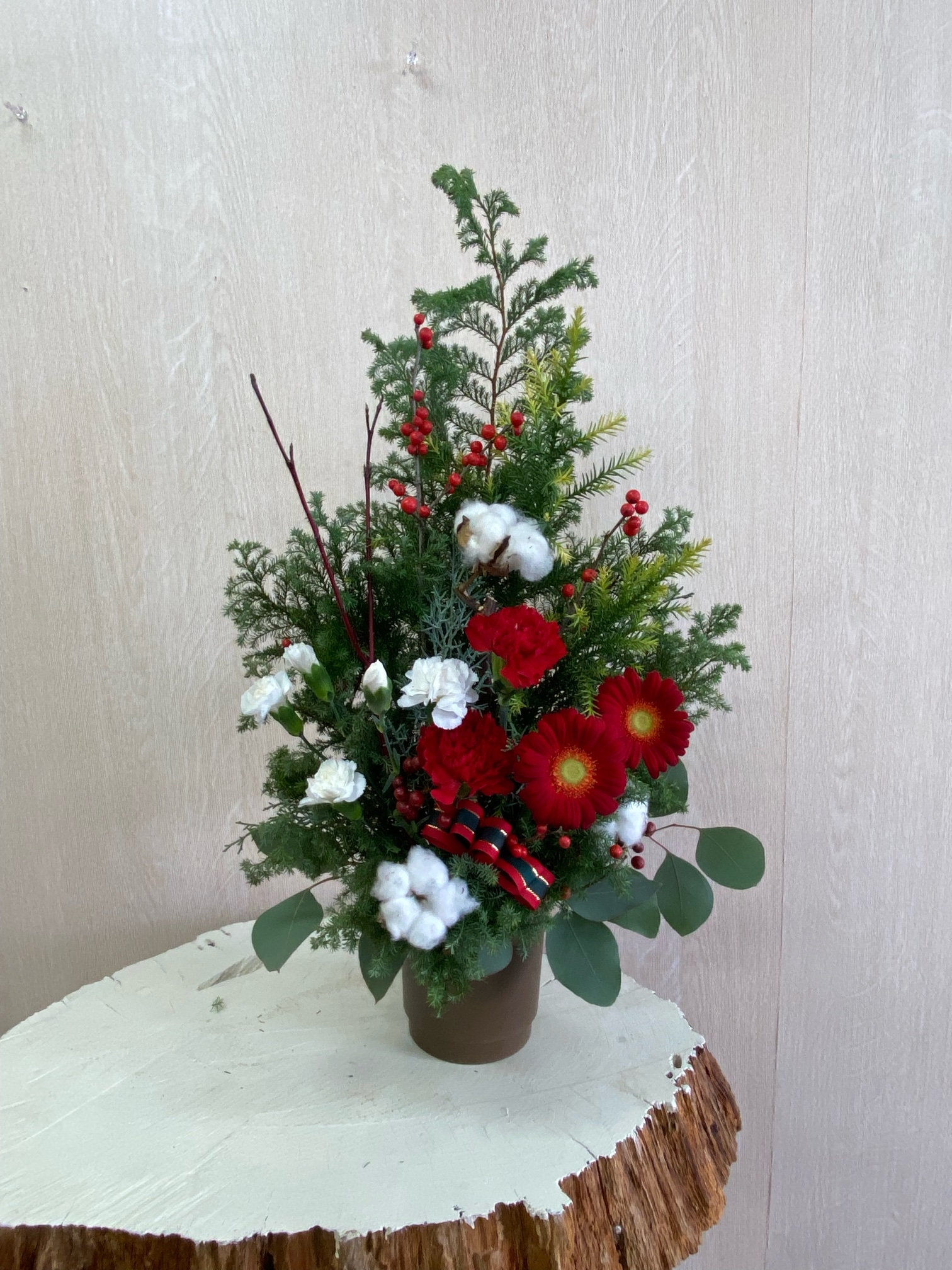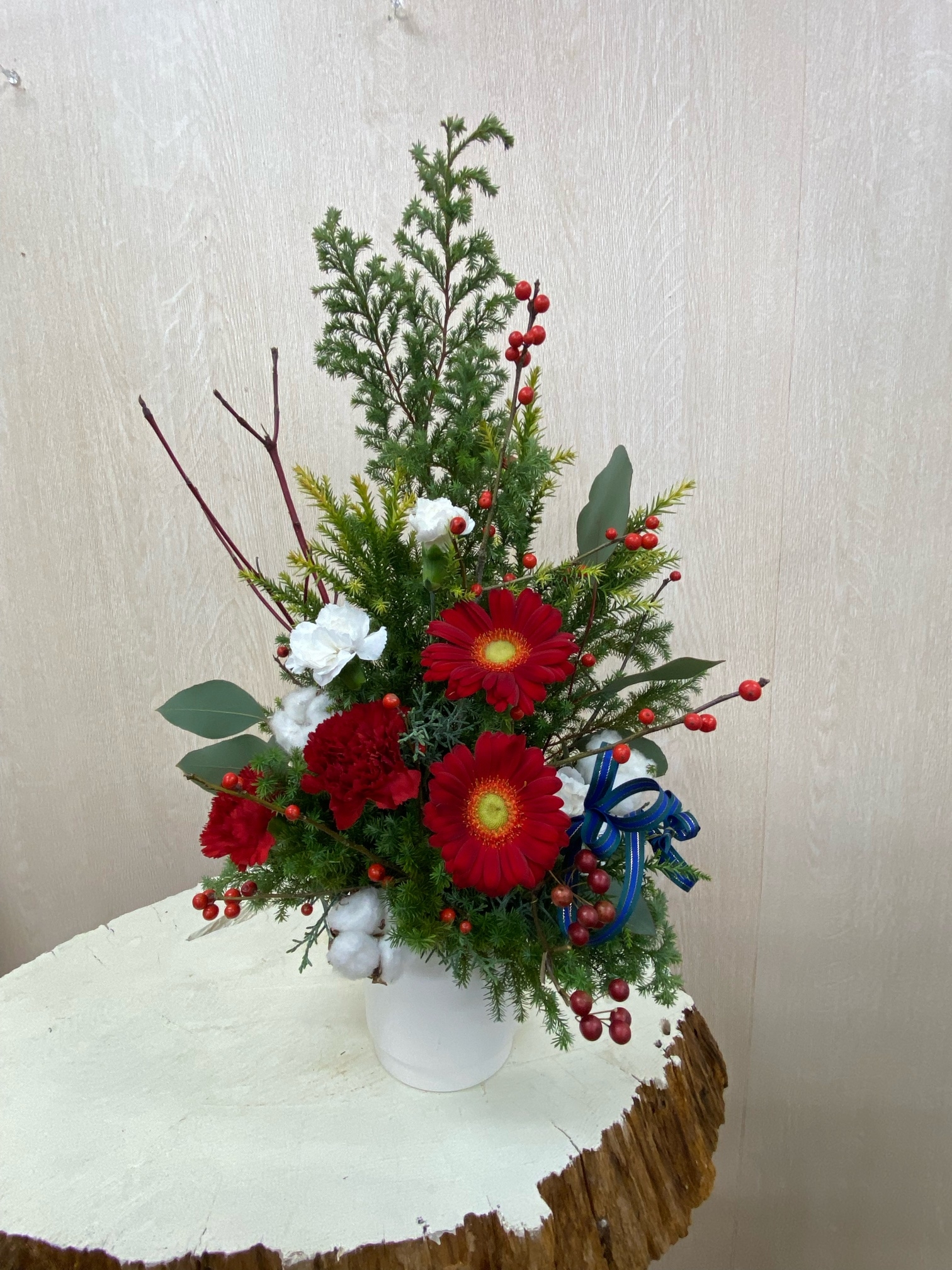 花材◇ヒムロ杉/雪冠杉/ブルーアイス/カーネーション/ガーベラ/コットンフラワー/ウィンターベリー・クリスマスチェアー(西洋ウメモドキ)/サンキライ/ユーカリ・ポポラス